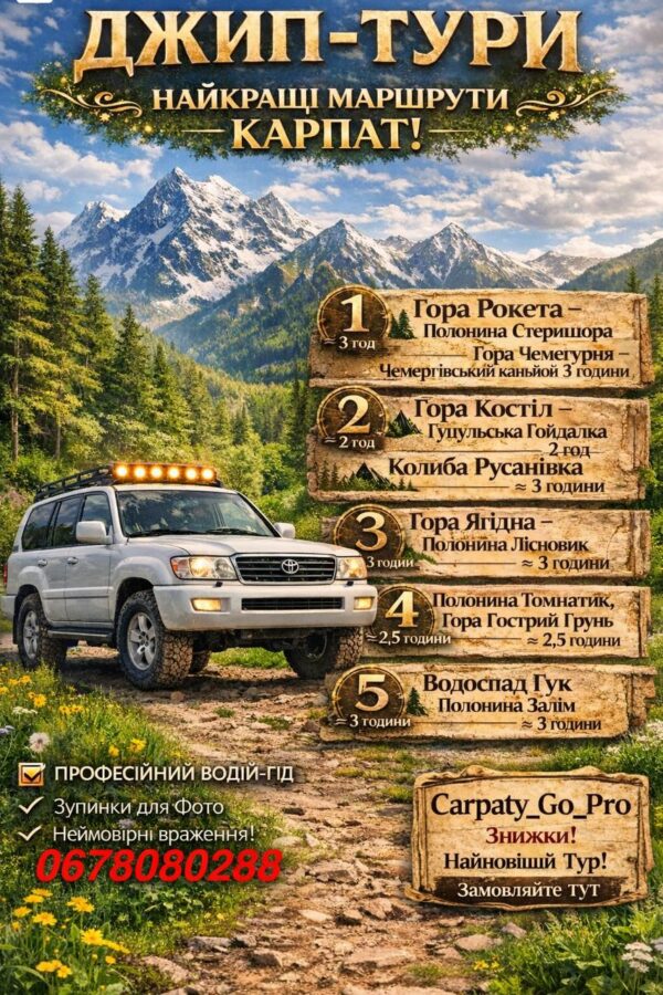 Ми організуємо джип-тури та квадро-екскурсії для компаній, сімей та пар. Є різні маршрути — від легких прогулянок до екстремальних підйомів.
